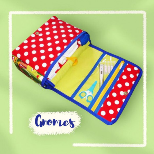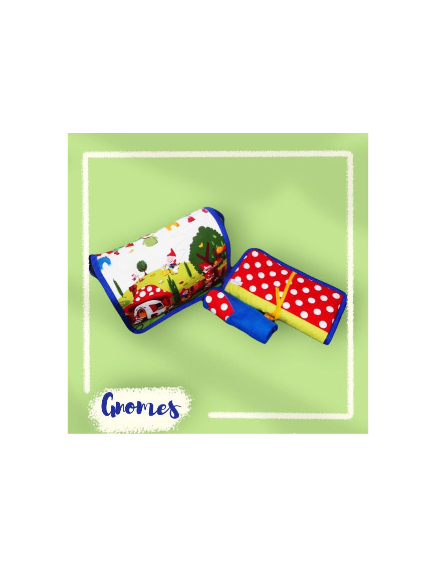 pequeña bolsa de pañales adorable con su colchón acolchado y un pañal manta "Los gnomos" que caen en la bolsa. Perfecta y conveniente para cambiar a su bebé en sus viajes a la guardería. ¿Qué va a poner un par de capas, crema, toallitas, etc ... de bolsillo con cremallera para guardar esencial del bebé.