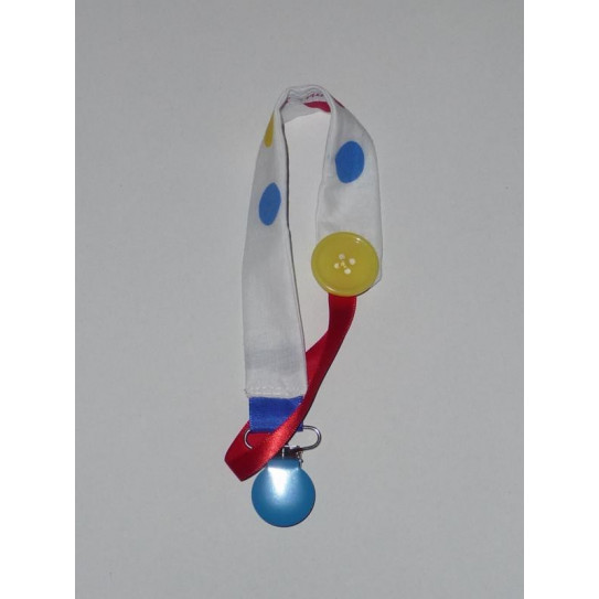 Esencial, el clip-pezón con su forma redonda azul abrazadera metálica, fijada en la ropa de bebé. Compuesto por una cinta de satén rojo para la fijación de la tetina.