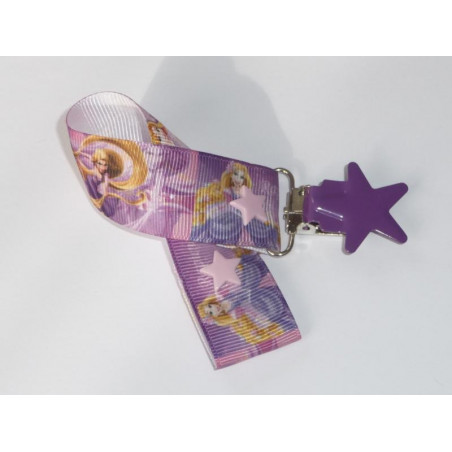 Esencial, el clip de chupete / ficticio "Rapunzel" extraíble con su pinza estrella púrpura de metal, se fija en la ropa del bebé. sistema de cierre que permite la variación de las abrazaderas y sujetadores chupetes para expresar sus deseos.