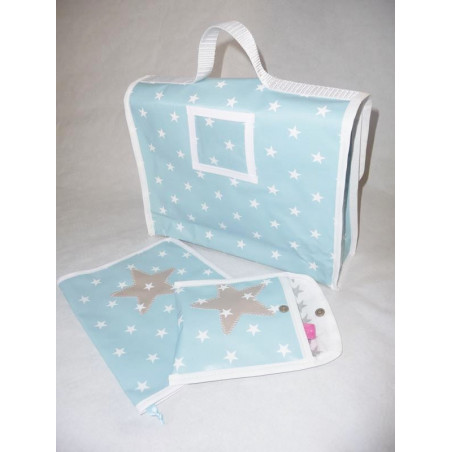 MATIERE CARTABLE : toile cirée bleu ciel étoilé et lin étoilé/ doublure : 100% coton blanc cassé étoiles lin/ anse : 100% polyester blanc / biais : blanc / SNACK BAG KIDS : toile cirée bleu ciel étoilé et lin étoilé / doublure : 100% coton blanc cassé étoiles lin/ intérieur : plastifié pour un nettoyage facile et rapide / fermeture : pression étoile en résine / PROTEGE CARNET : toile cirée bleu ciel et lin / doublure : 100% coton blanc cassé étoiles lin / marque-page : satin bleu ciel