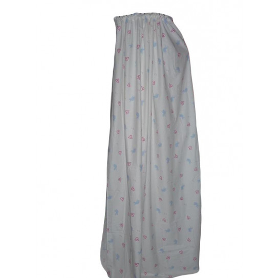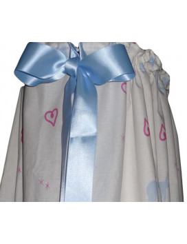PARTICULARITE : Convient pour une flêche de lit couronne. Se ferme à l'arrière par des lanières de satin blanc finies par un perle nacrée rose. Rubans de satin bleu ciel à nouer sur le devant. Passants intérieurs en ruflette réglables afin d'augmenter un pouvoir de serrage adapté à tout diamètre de ciel de lit en couronne. Taille XXL : se place soit en tête de lit , soit dans la longueur du lit et entourer ainsi les 3/4 de celui-ci.