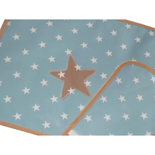 MATIERE : 100% toile cirée bleu ciel étoilé et lin étoilé/ Biais : 100% coton lin et blanc.