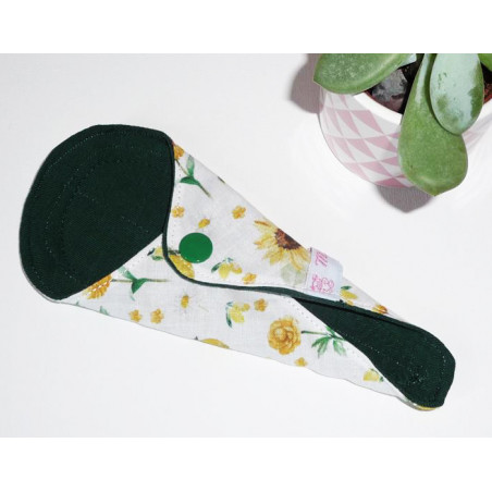 COMPOSITION : 100% coton imprimé (partie en contact avec la lingerie) / Intérieur : noyau absorbant composé d'1 épaisseur de coton molleton absorbant Oeko-Tex + ** PUL Oeko-Tex imperméable et respirant /100% jersey de coton uni bio (partie en contact avec la peau). Fermeture réglable : 2 pressions en résine Oeko-Tex