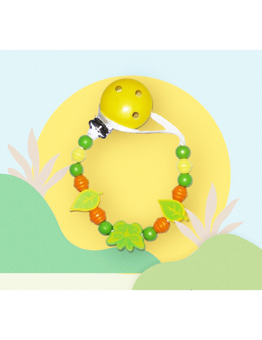Indispensable, the yellow and green wooden teat clip GREEN BUTTERFLY, attaches to the baby's clothes. Composed of a white satin ribbon and wooden beads.