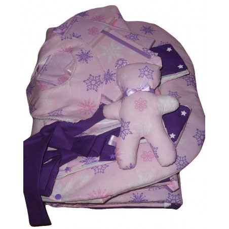 Very beautiful complete set of 8 pieces, for the nursery from birth. Ideal for a birth or as a gift. This set includes: 1 eyelet curtain, 1 turbulette, 1 bed bumper, 1 rattle cloth rattle, 1 comforter, 1 bandana bib, 1 table for the little touch of deco and 1 hammock teddy-tie, pink colors tender and violet.