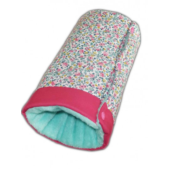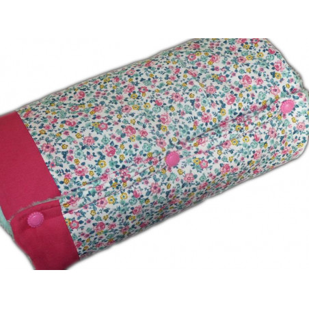 MATERIALS (BIO) : Side 1: 100% Oeko-Tex printed cotton + 100% plain Oeko-Tex fuchsia cotton / Face 2: ultra soft and soft clear mint comforter / Closure: 3 press studs in fuchsia-colored flower-shaped resin