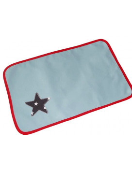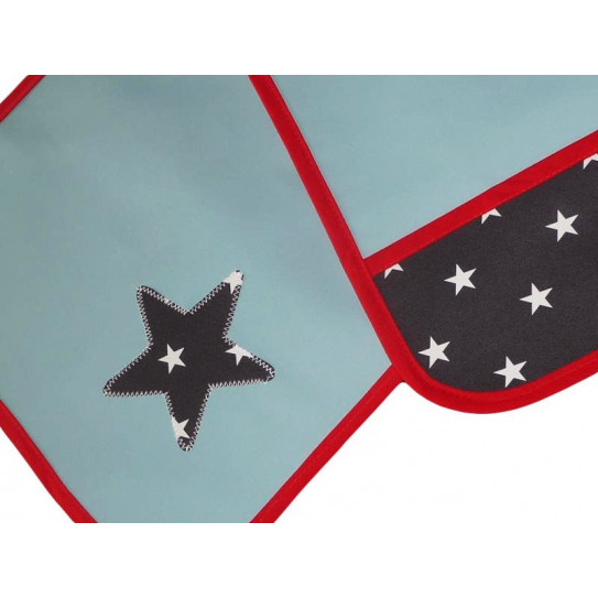 MATERIAL : 100% oilcloth sky blue - red and dark gray + small white stars / Bias: 100% red cotton.