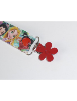 Essential, la clip ciuccio / fittizi "BABY PRINCIPESSE" rimovibile con il suo morsetto rosso fiore di metallo, è fissato sul vestiti del bambino. Chiusura istema S che permette di variare i morsetti di fissaggio e ciucci per esprimere i vostri desideri.