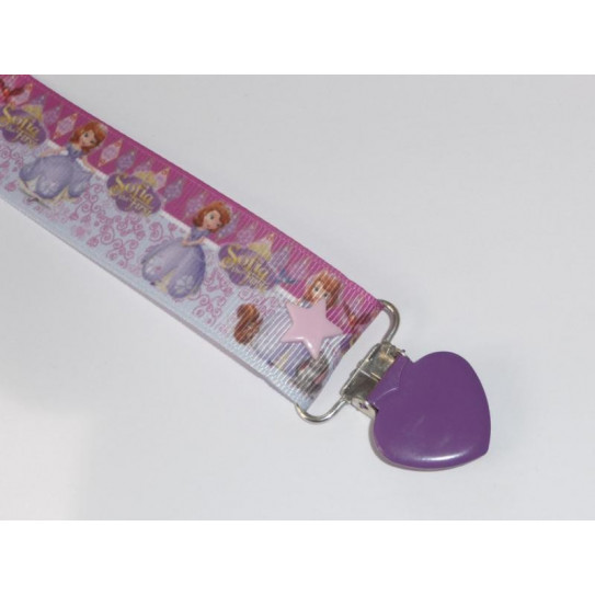 Essential, la clip ciuccio / fittizio "Principessa Sofia" rimovibile con la sua fascetta viola anima in metallo è fissata ai vestiti del bambino. Sistema di chiusura che permette di variare i morsetti di fissaggio e ciucci per esprimere i vostri desideri.