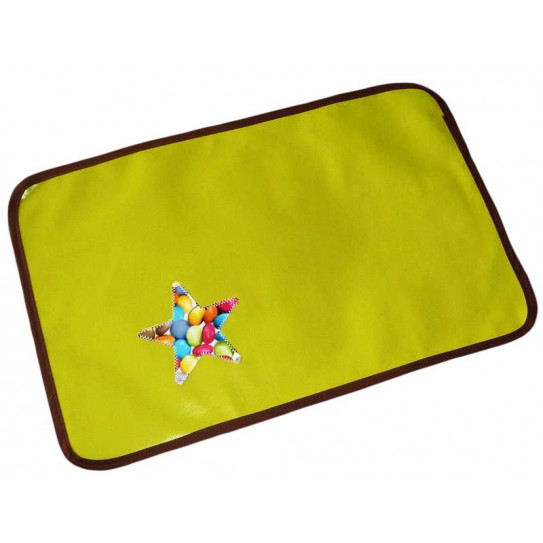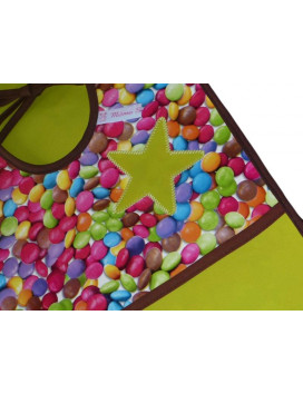 MATIERE : 100% toile cirée vert pomme et imprimée chocolats dragéifiés/ Biais : 100% coton chocolat.